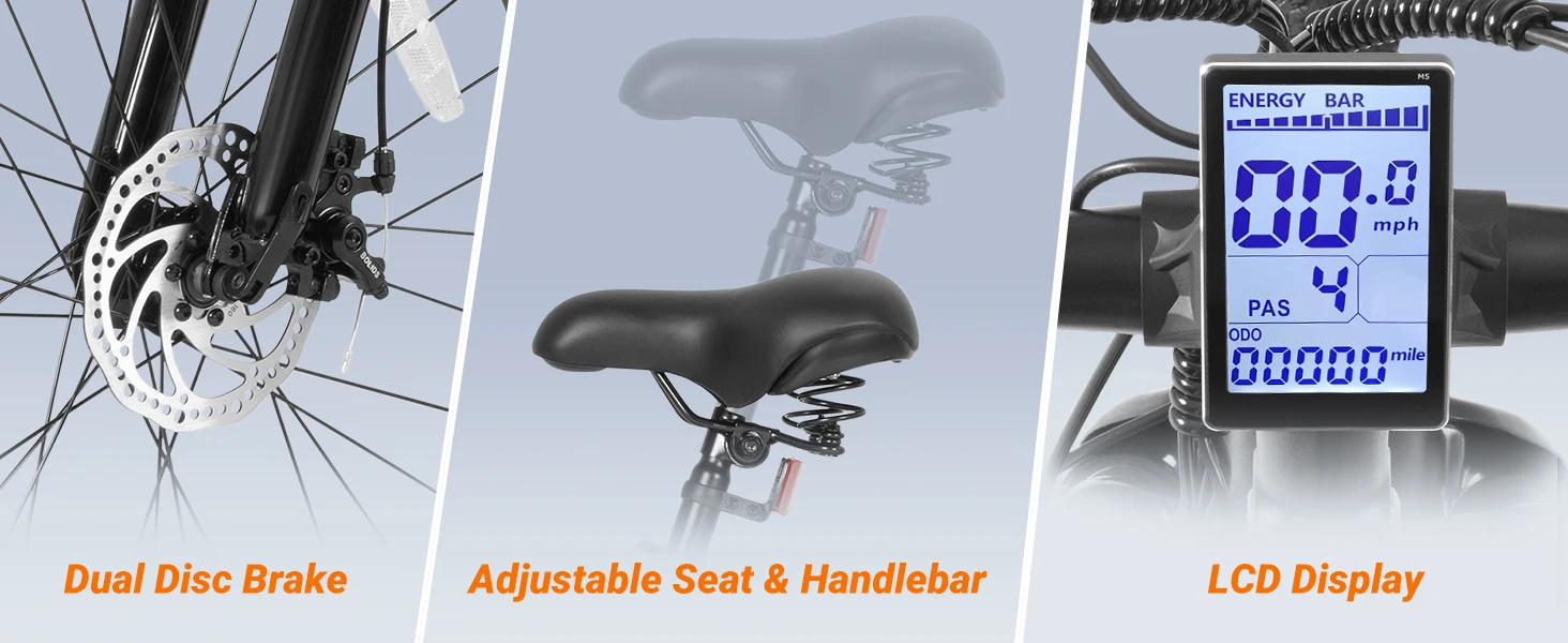 3 Working Modes: PAS mode will assist you with a moderate amount of power as you pedal the bike, kick in 1-3 levels of pedal assist to suit your needs. In pure electric mode, you can twist the throttle in any increments of power you desire. Pedal mode allows the rider to pedal as an ordinary bike. Booster mode will help you push your bike at 4.5-7.5 km/h when uphill, which will save you a lot of efforts.